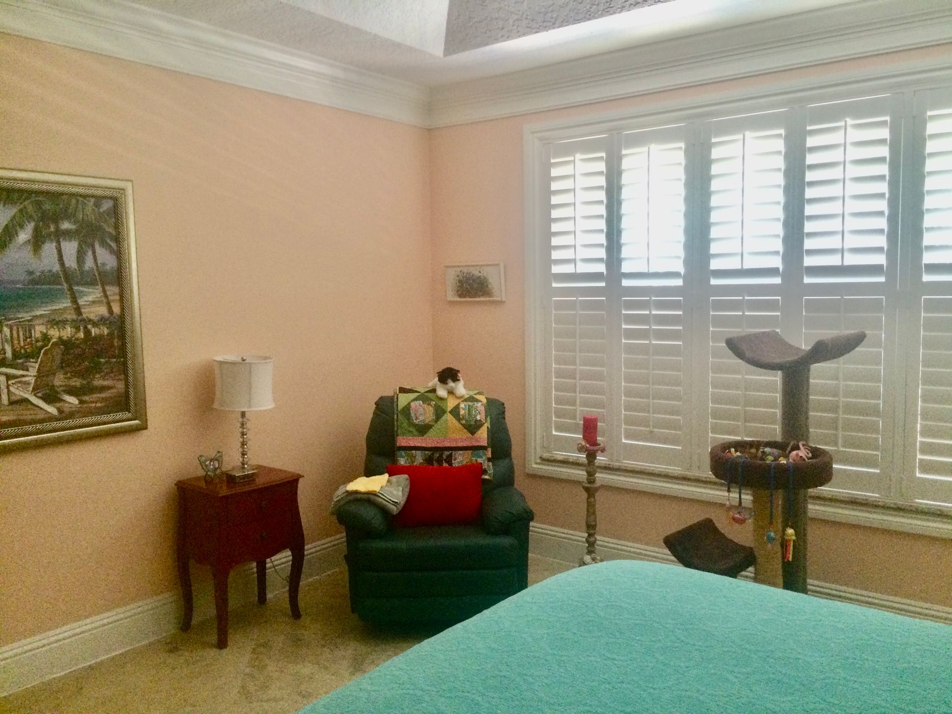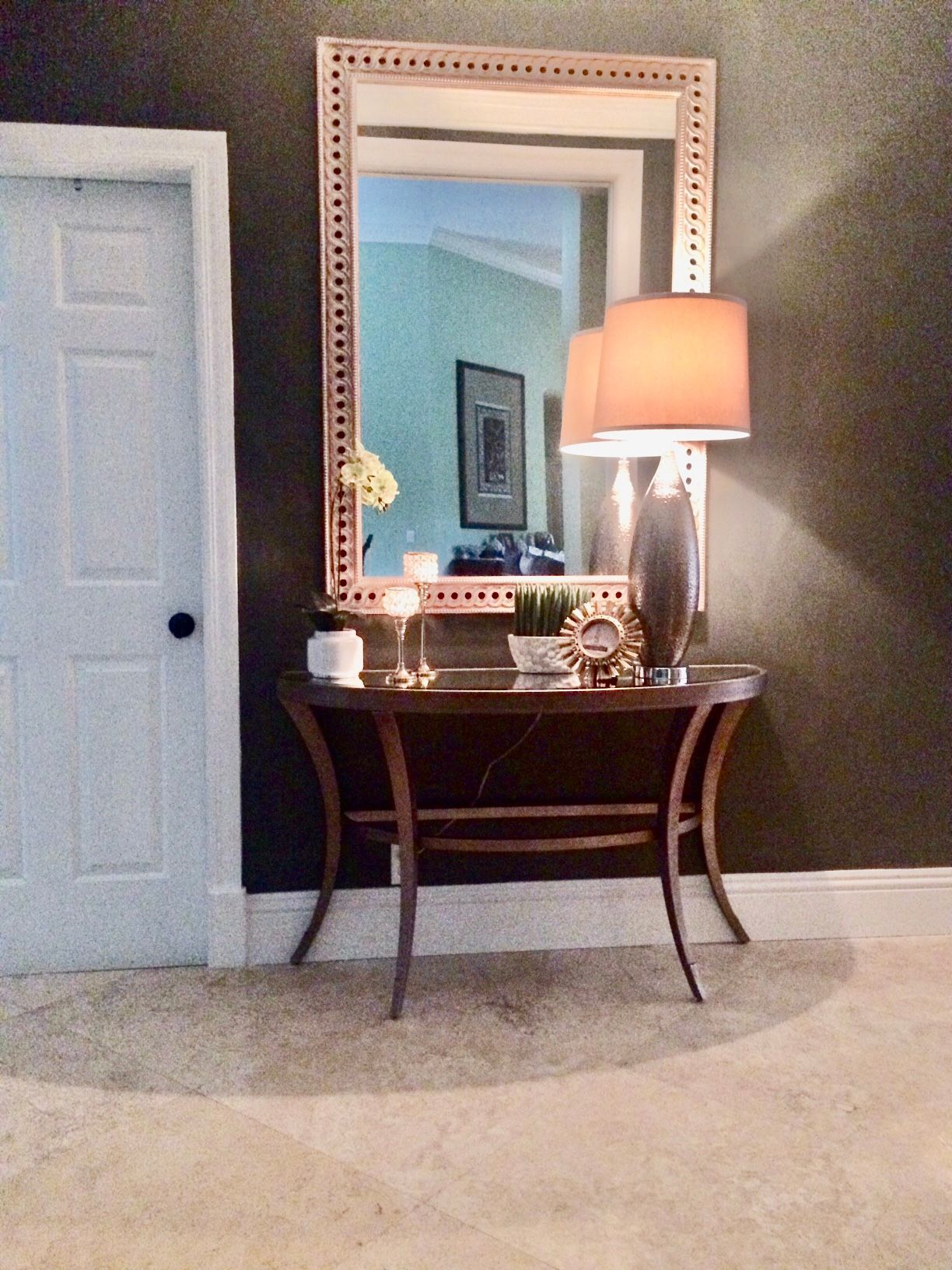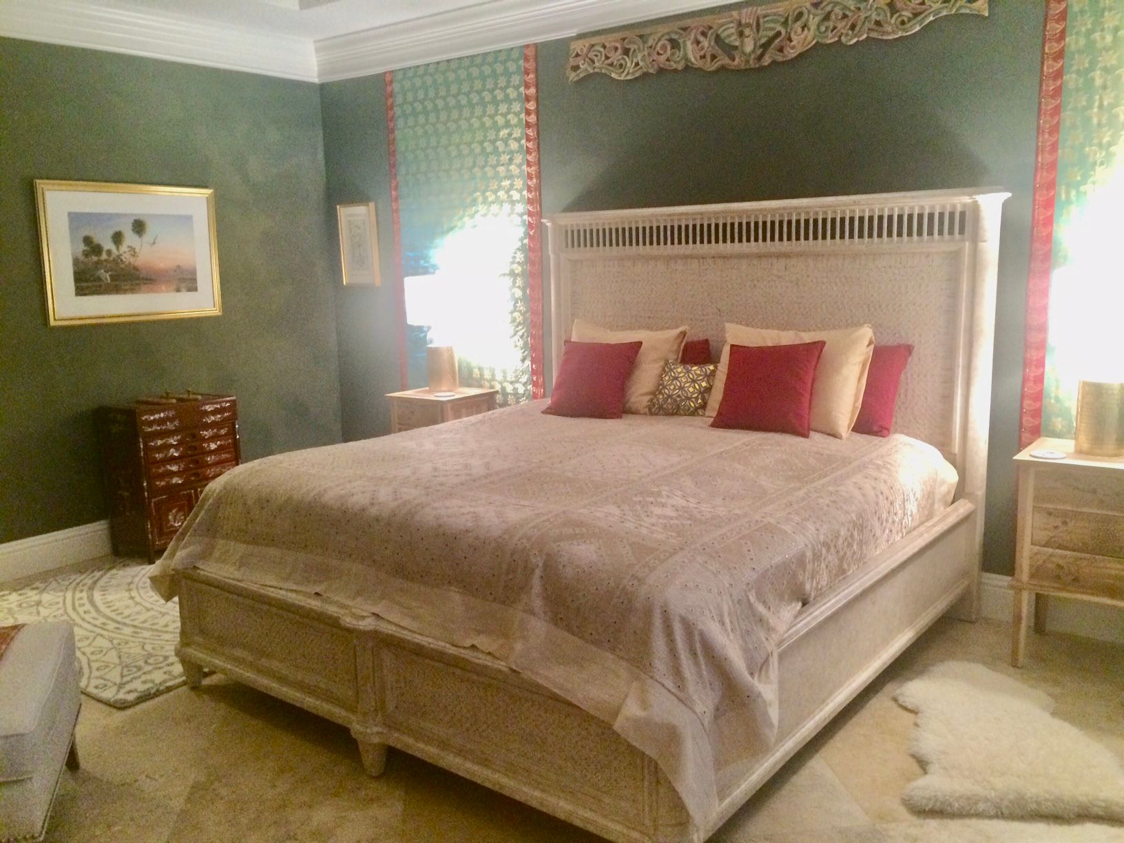 The exceptionally high ceilings of this Jupiter home have no form, function or personality until Celesa (and a few good friends) transform the space with warm grey plastered walls textured with a “shadow” mural giving the impression of a late afternoon sun passing through palm trees.