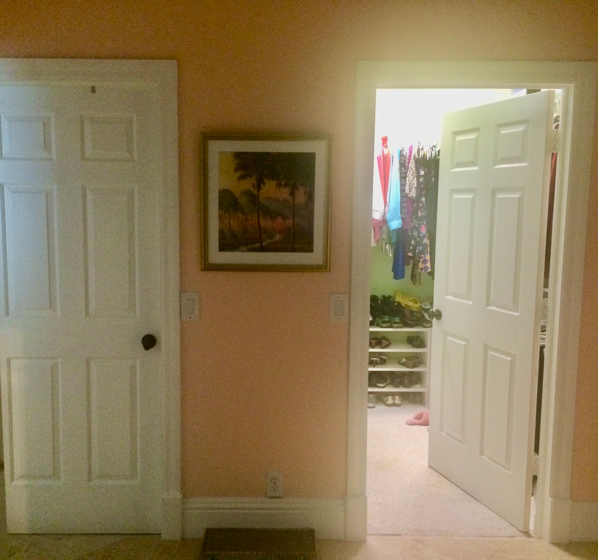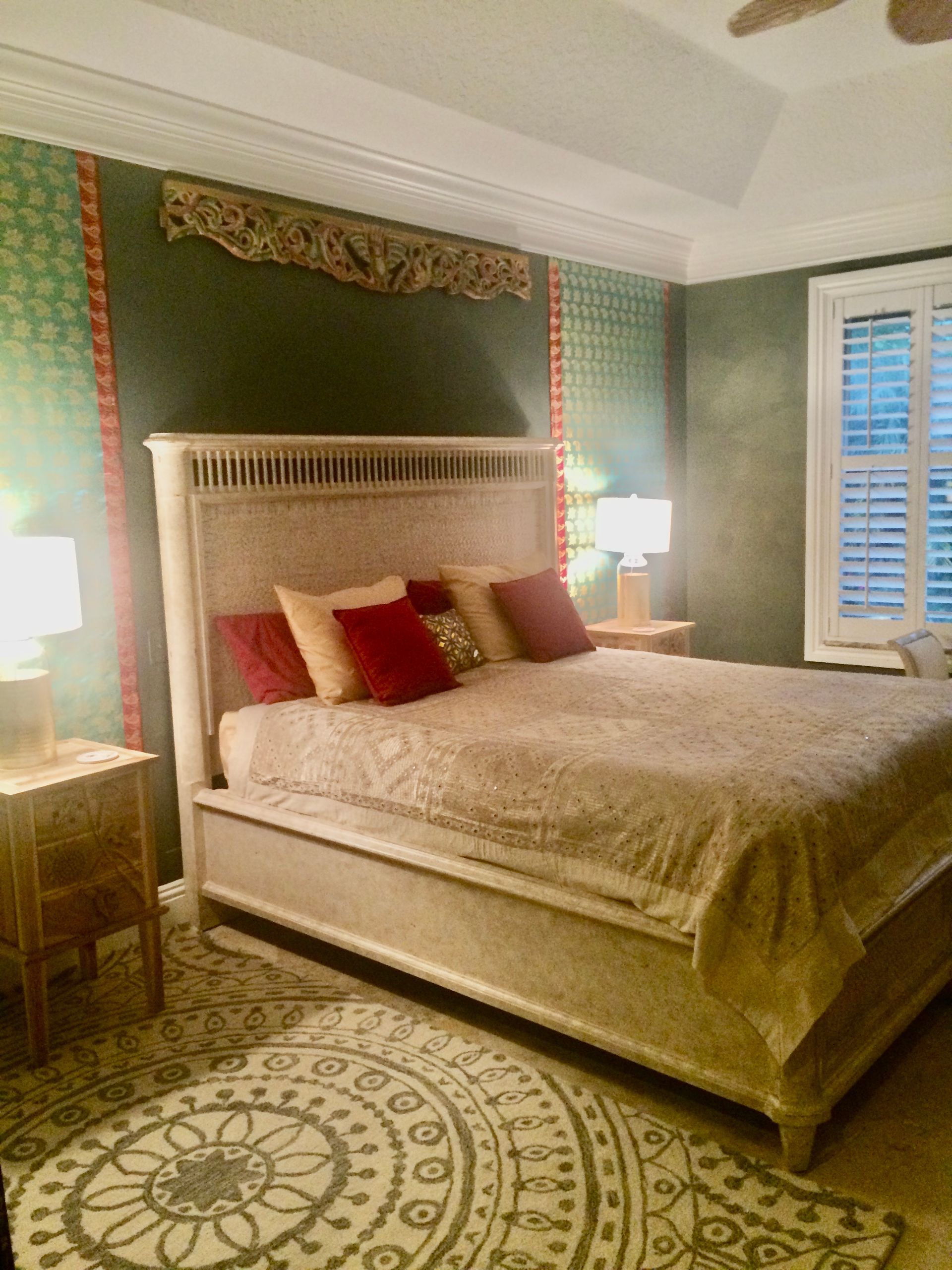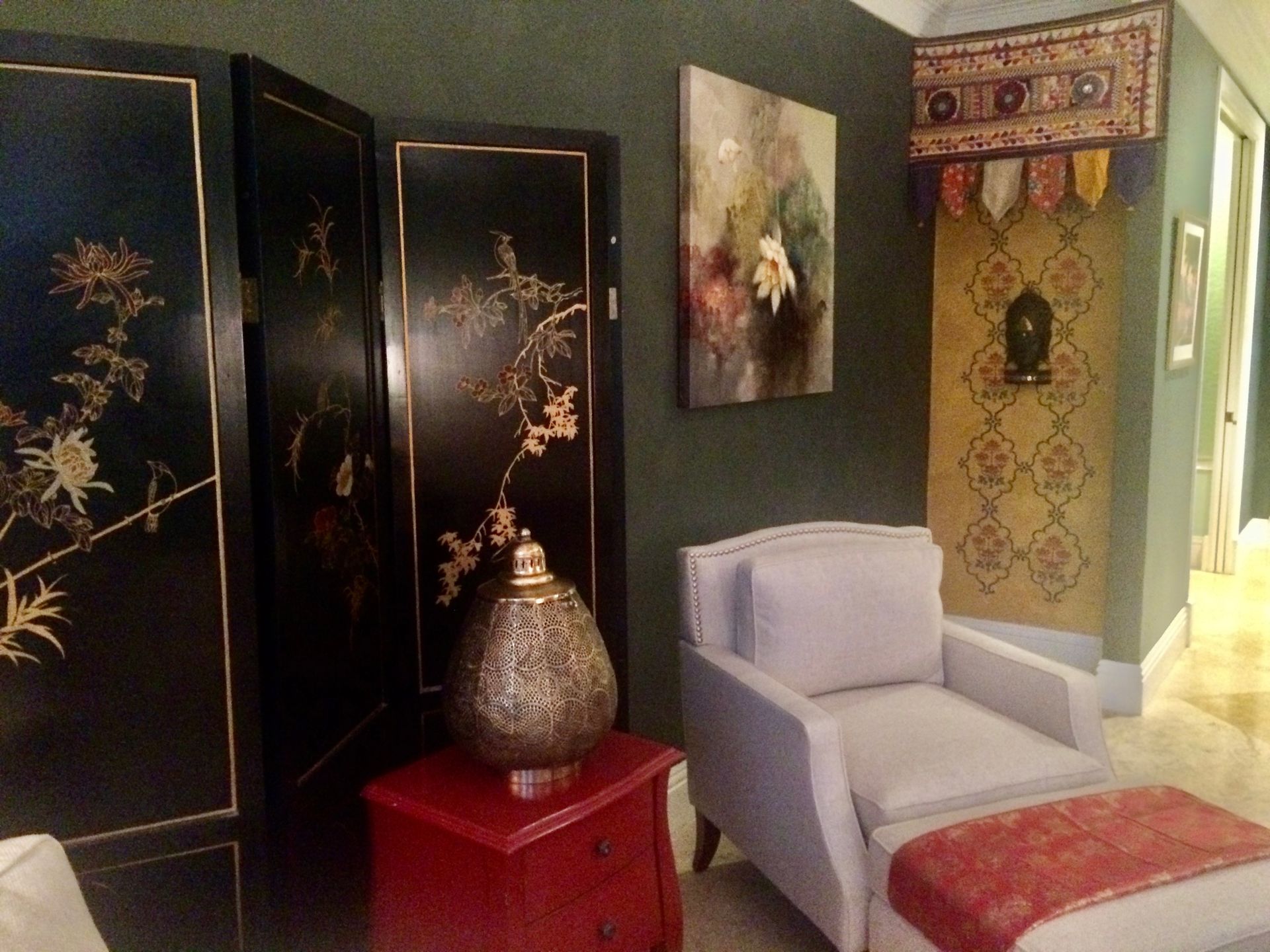 Seemingly an unfixable eyesore, an entry from the living room into the client’s master bedroom looked at two closet doors. It was uninviting, blocking the flow. Removing one of the doors was a simple solution. A rich emerald patina wall with an enchanting vignette was created in which a lovely mirror reflected light back into the space.