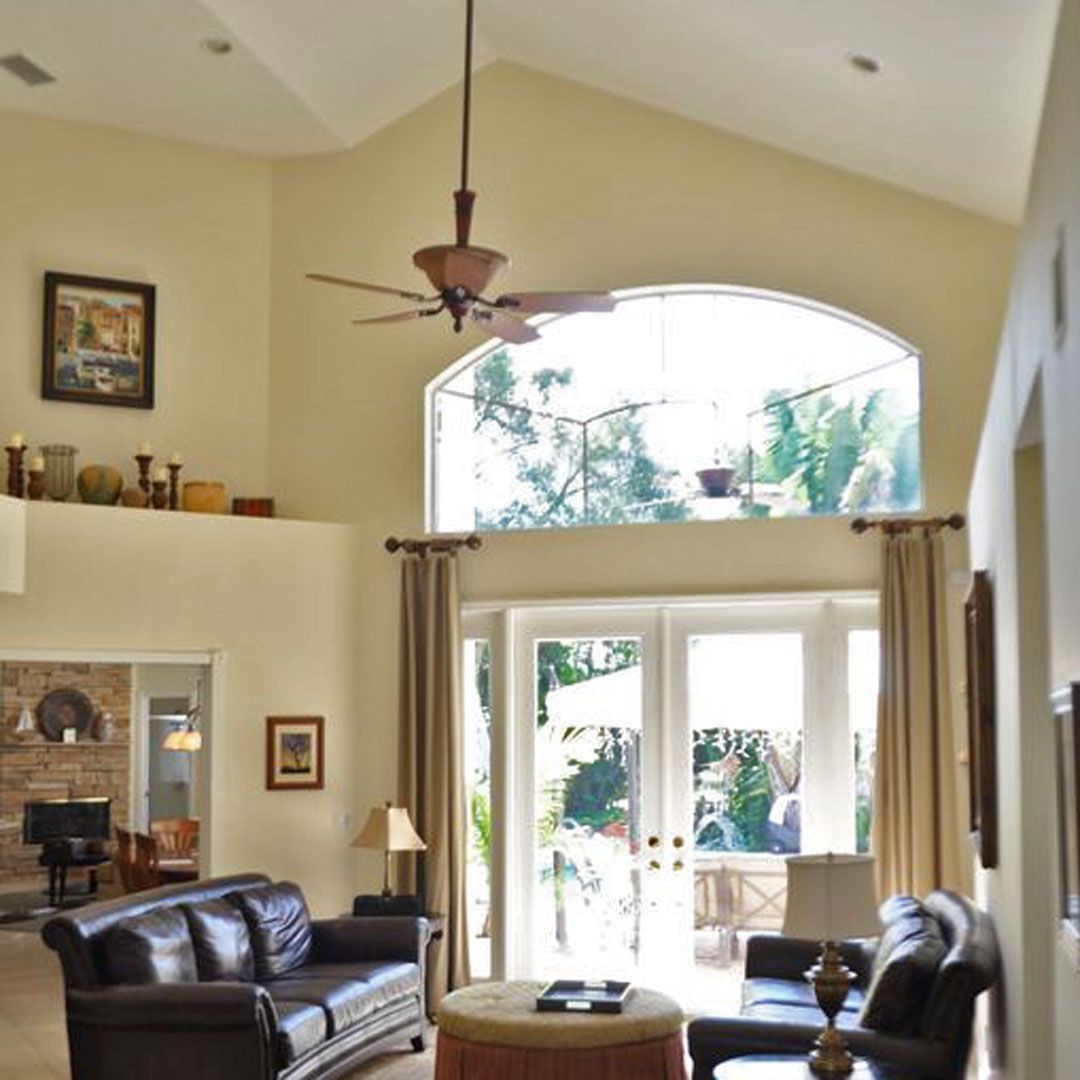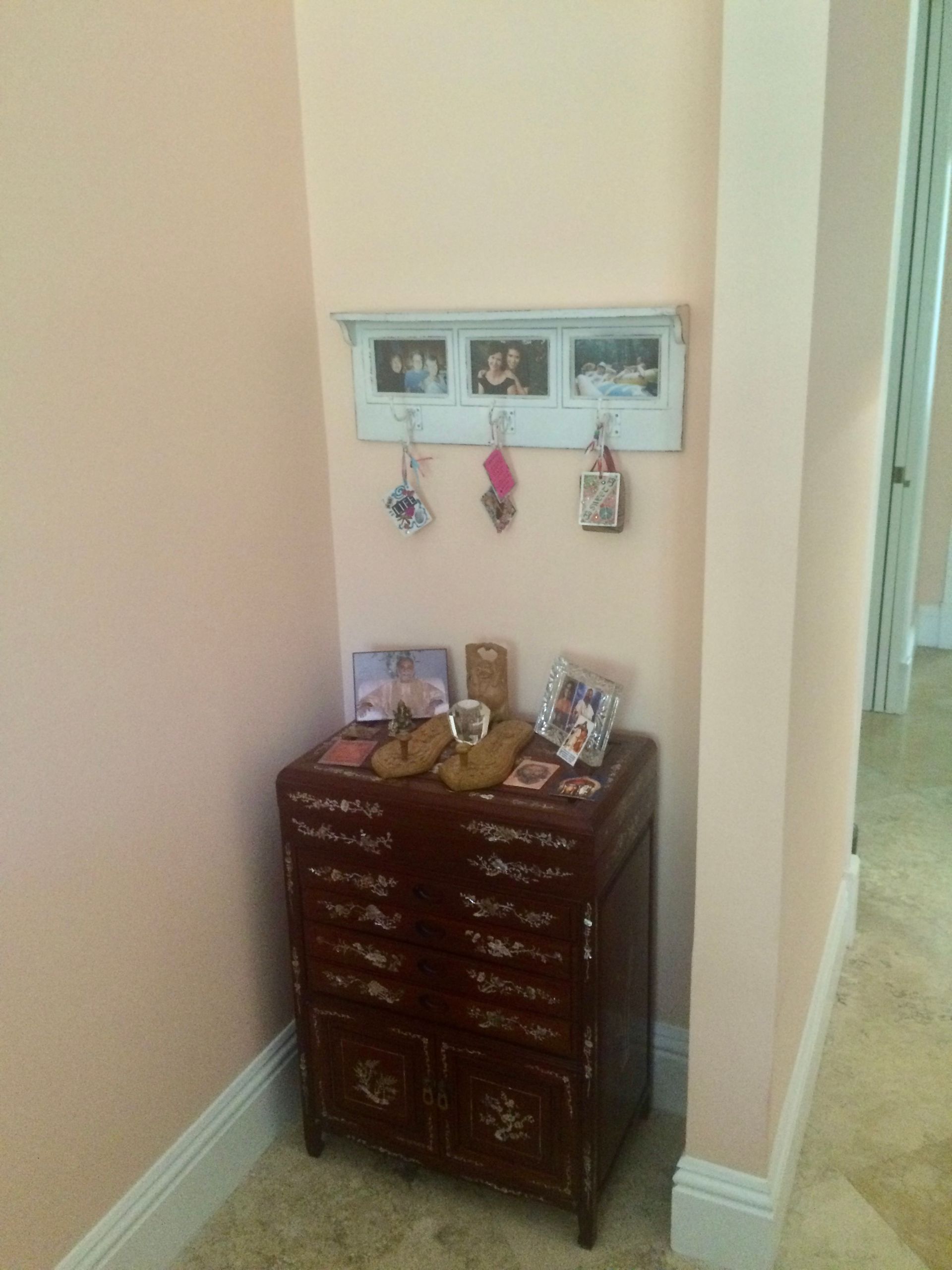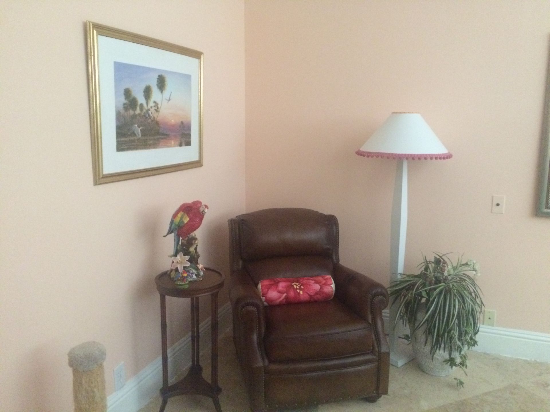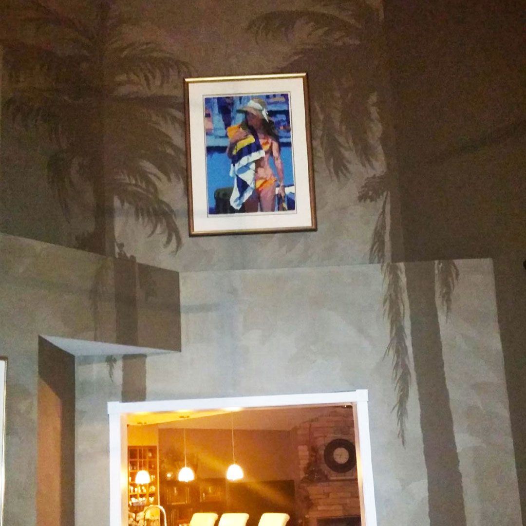 A painting inspired the idea to bring a beach scene inside. The “shadow play” of reflections of palm trees echoed from the client’s lanai transformed an outdated platform above a doorway leading from the kitchen area to the living room. Warm colors in a Ralph Lauren special wall treatment were done by CJ in a brushed pearl of Dust Storm with shadows done in a matte Smoky Taupe.