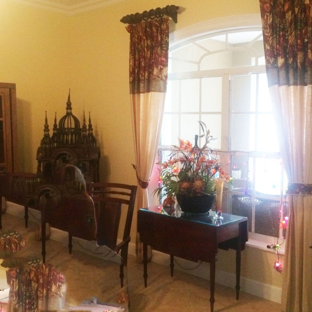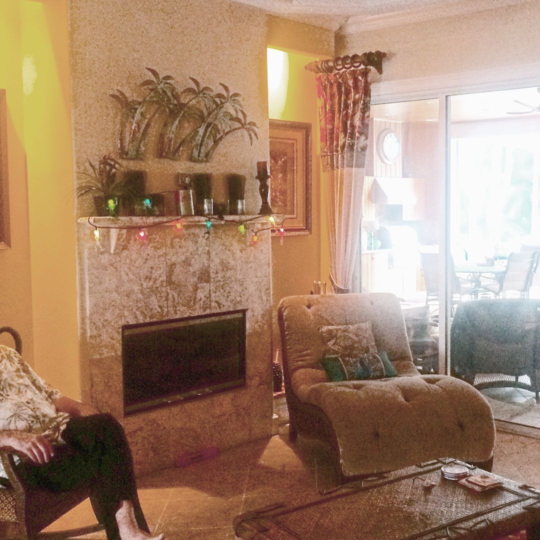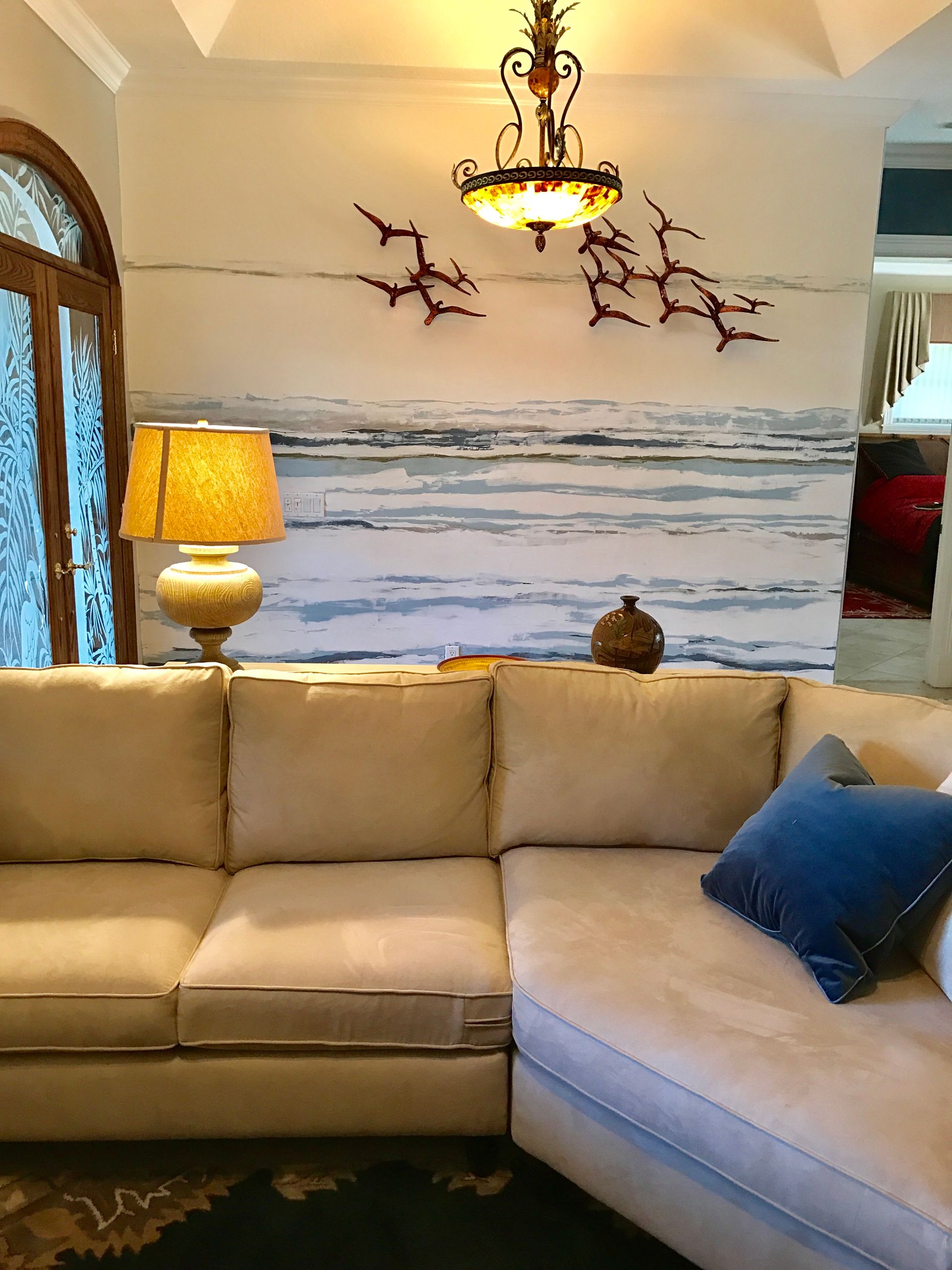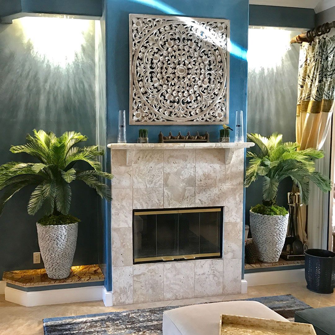 CJ was able to make new curtain tops from HomeGoods drapes with the right color and pattern to re-fit the bottom section of the drapes because the clients wanted to keep the same rods and hooks. New lights were installed in the recesses beside the fireplace that looked like raindrops falling on queen palms in decanters that went from a brown to a white washed planters with a few strokes of paint by CJ. All this was contrasted against the ocean blue Venetian Plaster.