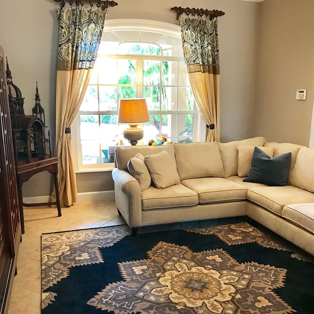 They asked her to repurpose many pieces of furniture but were needing to remedy a debunked foyer entry that’s flooring did not transition into the open living room. They also had a “Beam Me Up Scotty” soffit over a seating area in front of the fireplace with an outdated lounge chair and rocking chair with a bamboo coffee table and metal wall decorations that screamed “please take me to the Salvation Army!”
