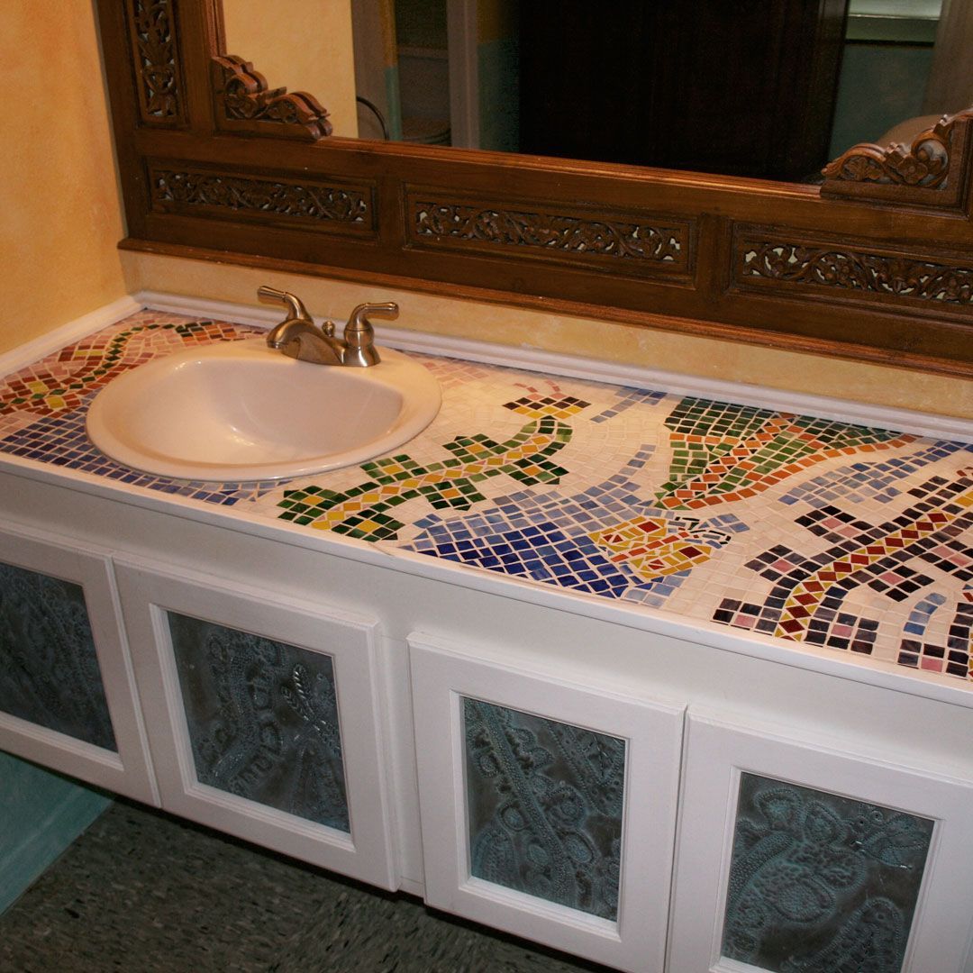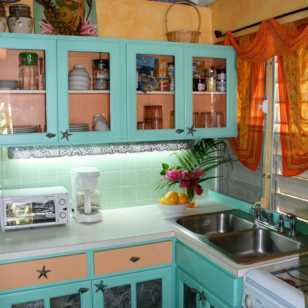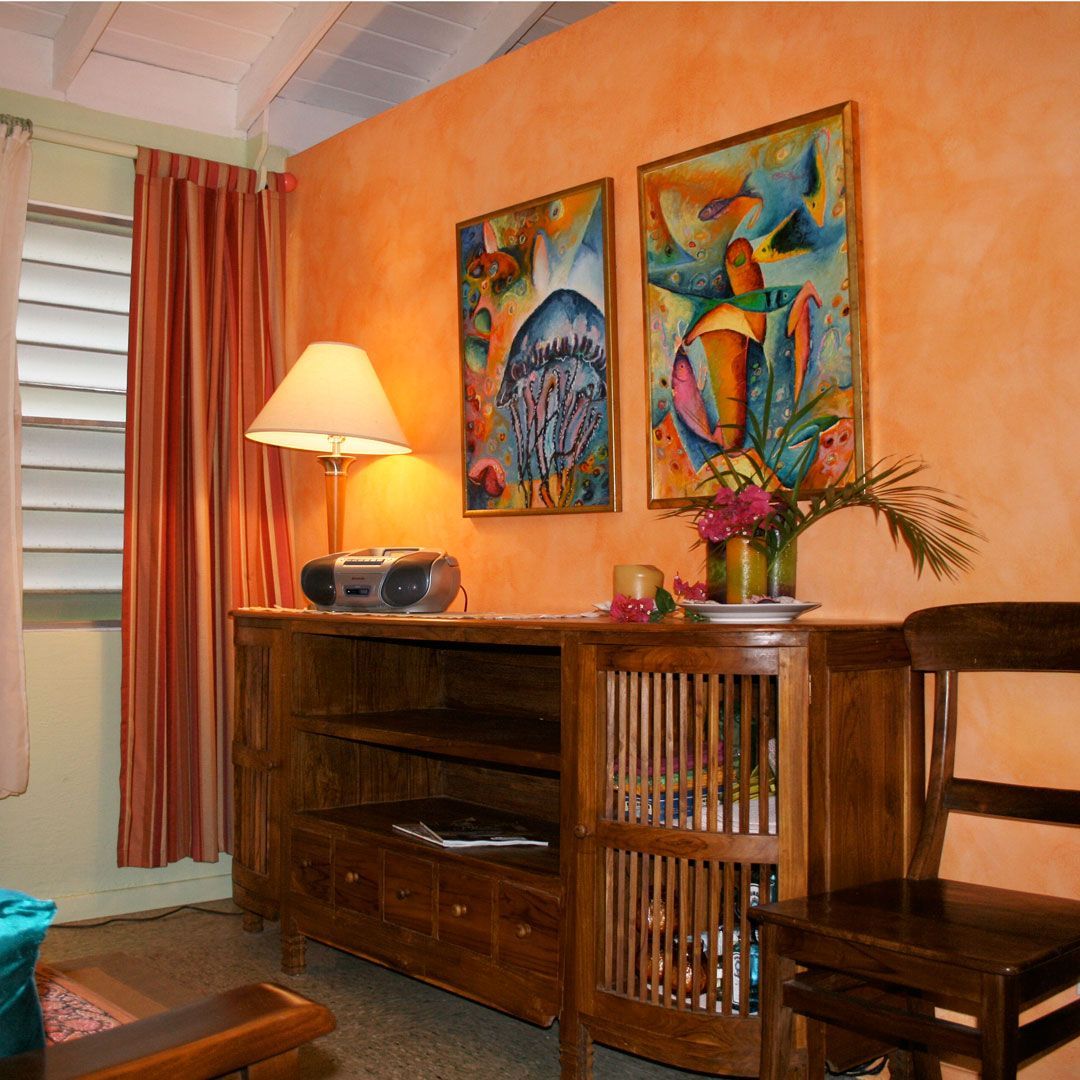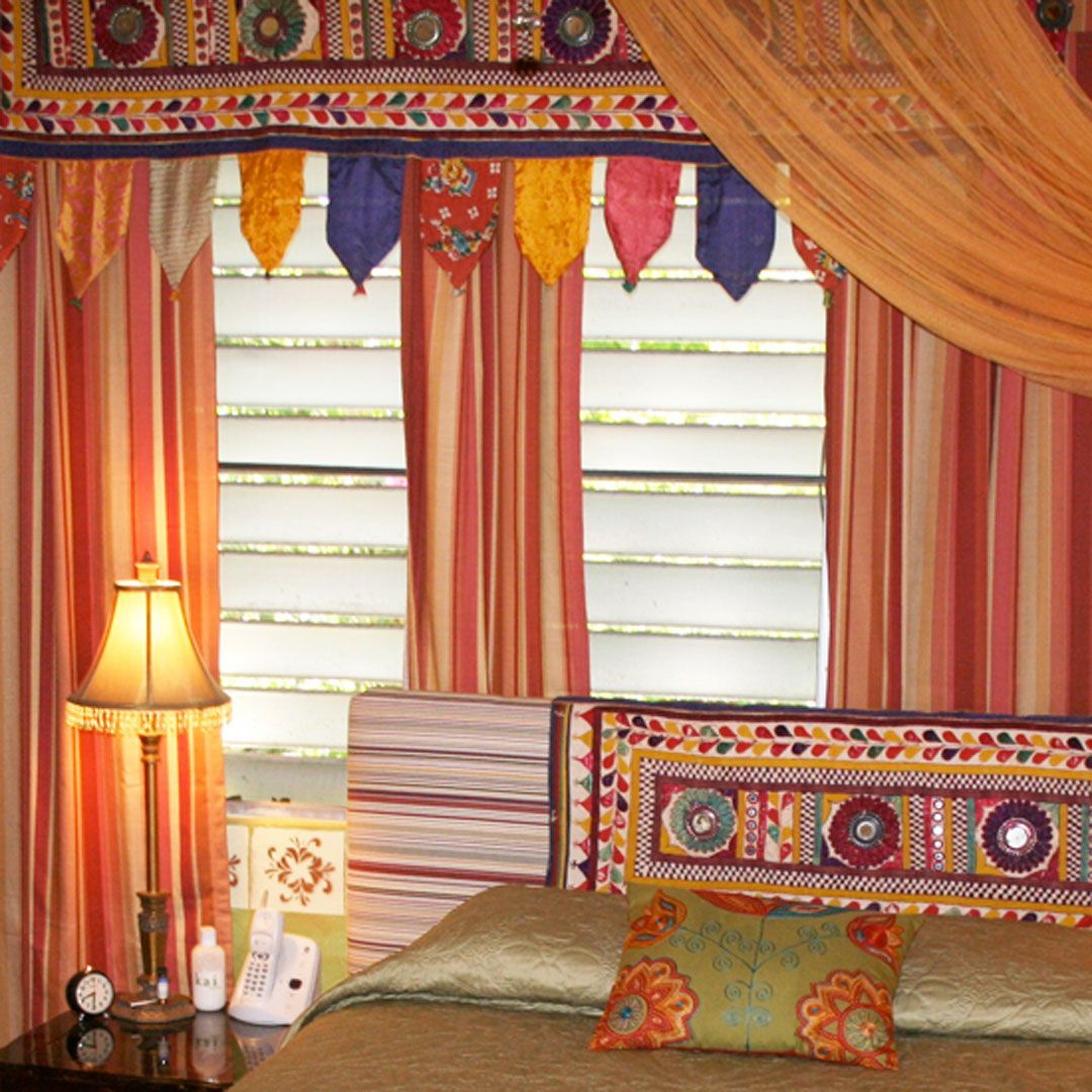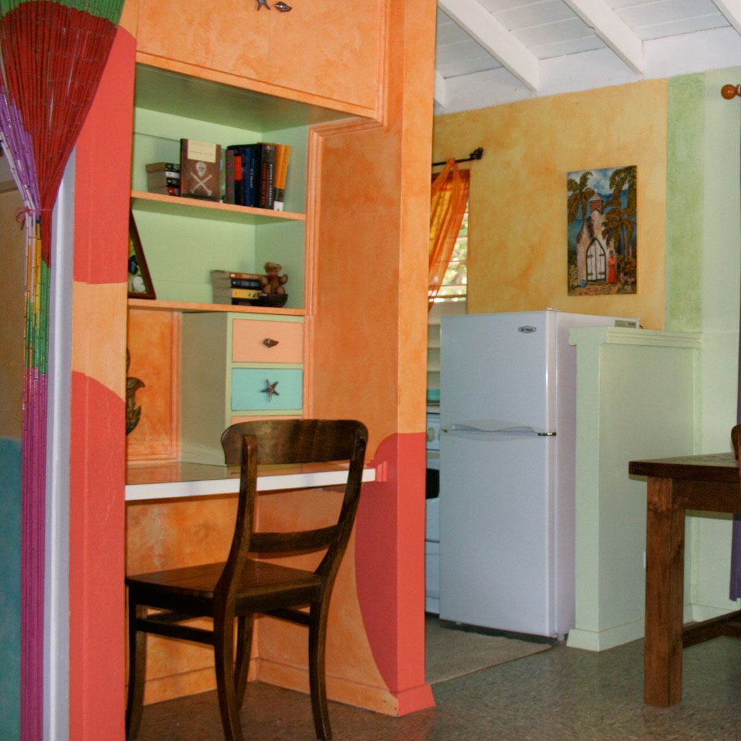 From stunning RVs and yacht interiors to vacation rental homes and hospitality houses, CJ’s designs reflect the personality of the owners or the people they expect to serve. This 450 sq.ft. seasonal rental on the island of Tortola in the British Virgin Islands was no longer meeting its earning potential when Celesa updated every nook and cranny. Dingy walls and kitchen cabinets with only half the sliding door remaining, an ensuite bathroom with rusty lighting and broken everything were updated, along with new glass-front upper kitchen cabinets doors with contrasting exciting Caribbean colors. Tin workfronts were fitted into new bottom cabinets in the kitchen and lavatory. An office nook takes on new life with super graphic wall treatments duplicating the pattern in the colorful bead room divider. A teak Balainses mirror creates ambiance in the bedroom with new lighting and coordinating mosaic tile countertop that duplicates the tropical motif of tin work-doors and a corner painting, all designed and produced by CJ. A hard core door is padded and upholstered for a new headboard, and exotic Moroccan textiles pennants provide a rich atmosphere for slumber.